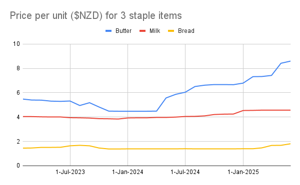 Note that in the graph above, the New Zealand retail price of butter remains high and continues climbing in late 2025 - even after global spot prices stabilise across the board.
