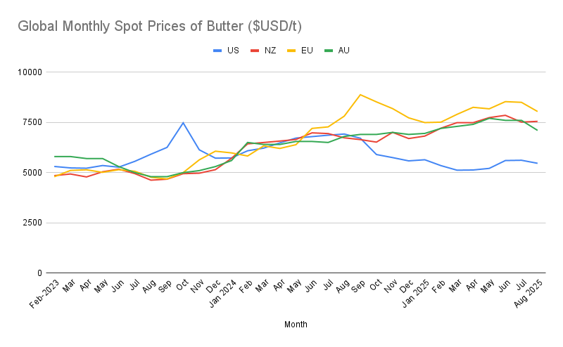 The international market: Global Monthly Spot Prices of Butter in $USD per tonne.
